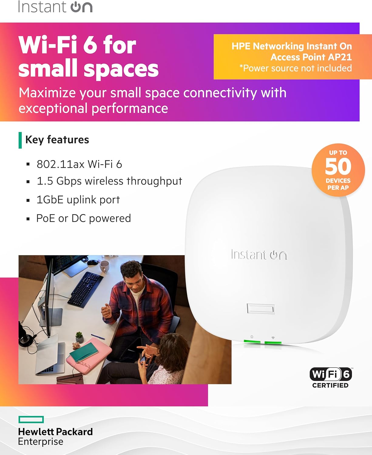 • The Instant On AP21 access point offers an exceptional indoor wireless experience for small spaces that need the latest in connectivity. Designed for network sites of 1 to 2 access points, this access point offers cost effective Wi-Fi Certified 6 connectivity for small retail stores, cafes, small meeting rooms, and home networks